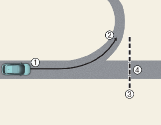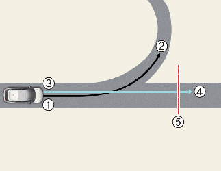 When the vehicle's driving route is recognised as the main road by maintaining the main road instead of the navigation set route, Highway Curve Zone Auto Slowdown function will operate. Depending on the distance to the curve and the current vehicle speed, vehicle deceleration may not be sufficient or may decelerate rapidly.