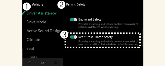 Rear Cross-Traffic Collision-Avoidance Assist settings