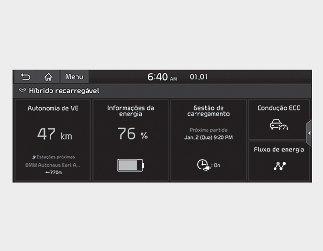 O menu Plug-in Hybrid (híbrido plug-in) consiste em cinco secções: [EV range] (gama EV), [Energy information] (informações sobre energia), [Charge management] (gestão da carga), [ECO driving] (condução ECO) e [Energy flow] (fluxo de energia).