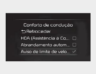 • Se “Speed Limit Warning" (Aviso de limite de velocidade) estiver selecionado, o Aviso de limite de velocidade informa o condutor do limite de velocidade. A função avisa ainda o condutor quando o veículo é conduzido a uma velocidade superior ao limite de velocidade.