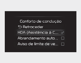 Se a opção "Highway Driving Assist" (Assistência à condução em autoestrada) for selecionada, ajuda a manter a distância face ao veículo da frente, a manter a velocidade definida e a manter o veículo entre faixas.