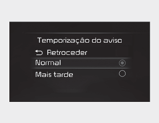 Selecione “Late” (Mais tarde) para “Warning Timing” (Temporização do aviso) em situações de trânsito ligeiro ou de velocidade de condução reduzida.