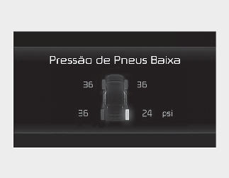 Quando as luzes de aviso do sistema de monitorização da pressão dos pneus acenderem e a mensagem de aviso for exibida no ecrã LCD de conjunto, isso significa que um ou mais pneus têm pressão insuficiente. Luz indicadora posicional de pressão insuficiente dos pneus indica qual o pneu que sofreu uma perda significativa de pressão, acendendo para isso a luz de posição correspondente.