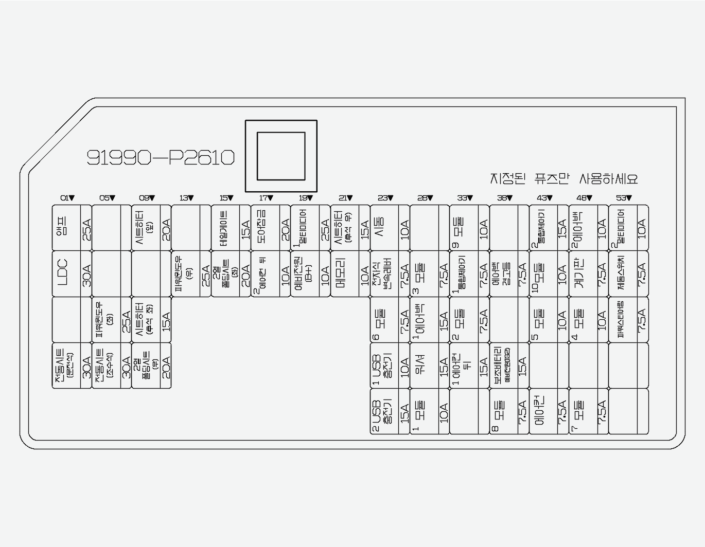 * 엔진룸 퓨즈 박스 내 이름없는 공란 퓨즈는 예비 퓨즈가 아니므로 임의로 빼지 마십시오. 임의로 뺄 경우 해당 시스템이 작동하지 않을 수 있습니다.