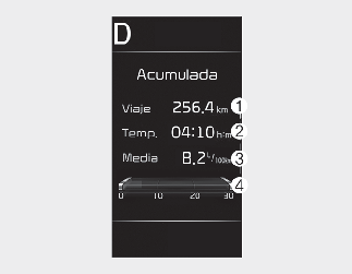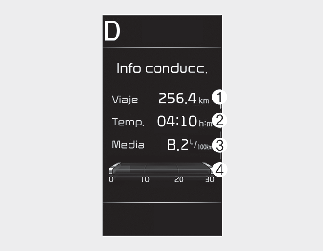 La pantalla muestra la distancia del recorrido (1), el tiempo de conducción total (2), la eficiencia del consumo medio de combustible (3) y el consumo instantáneo de combustible (4, si está equipado).