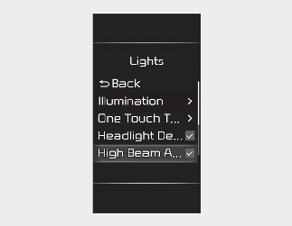 Con el interruptor de encendido o el botón ENGINE START/STOP (inicio/parada del motor) en la posición ON (activado), seleccione "Lights (Luces) → High Beam Assist (Asistencia luces largas)" en el menú Ajustes para activar la función de asistencia de luces largas y cancele la selección para desactivar la función.