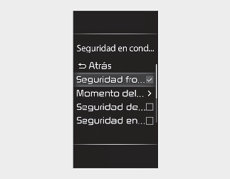 Seguridad frontal: En función de los niveles de riesgo de colisión, sonará un aviso sonoro y el frenado recibirá asistencia. Si se desactiva el siguiente menú, la asistencia de prevención de colisión frontal se apagará y el testigo de advertencia (