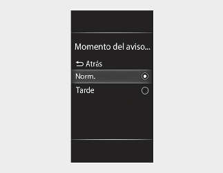 Utilice "Normal" en condiciones normales de conducción. Si el tiempo de aviso parece escaso, cámbielo a "Tarde".