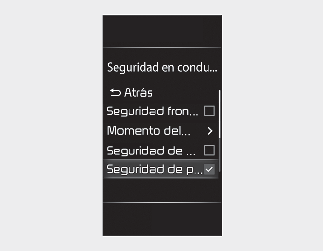 Con el interruptor de encendido o el botón ENGINE START/STOP (inicio/parada del motor) en la posición ON (activado), seleccione "User Settings (Ajustes Usuario) → Driver Assistance (Asistencia al conductor) → Driving Safety (Seguridad en la conducción)" en la pantalla LCD o "Vehicle Settings (Configuración del vehículo) → Driver Assistance (Asistencia al conductor) → Driving Safety (Seguridad en la conducción)" en el sistema de infoentretenimiento para indicar si se utiliza o no cada una de las funciones.