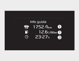 Vengono visualizzati: la distanza percorsa totale (1), il consumo medio di carburante (2) e il tempo di guida totale (3) una volta per ciascun ciclo di accensione.