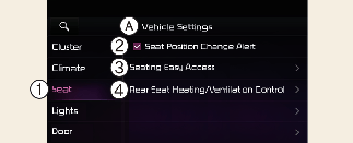 בחר הגדרות ← רכב ← מושב מתפריט ההגדרות במסך מערכת המידע והבידור, תוכל להשתמש בפונקציות נוחות שונות.