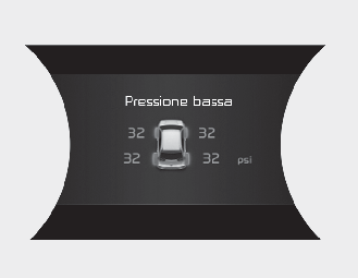 Quando gli indicatori spia del sistema di monitoraggio pressione pneumatici sono illuminati e viene visualizzato il messaggio spia sul display LCD quadro strumenti, vuol dire che uno o più pneumatici sono sotto-gonfiati in misura significativa. L'indicatore di pneumatico sgonfio segnala quale pneumatico è molto sgonfio accendendo la spia di posizione corrispondente.