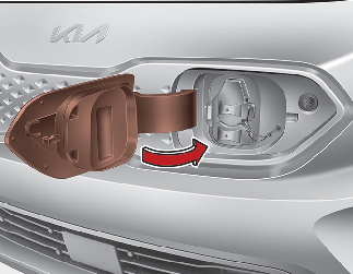 Jeżeli blokada złącza ładowania nie zwalnia się nawet po zwolnieniu blokady drzwiczek, należy skorzystać z dźwigni zwalniania awaryjnego komory silnika i wcisnąć przycisk zwalniania blokady złącza ładowania (1), by odłączyć złącze ładowania. W takim przypadku możliwa jest awaria blokady złącza ładowania – zalecamy przegląd pojazdu u autoryzowanego dealera/partnera serwisowego marki Kia.