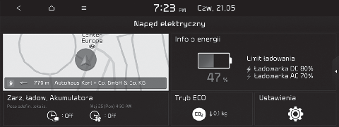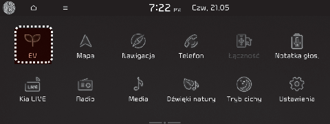 * Zdjęcie ekranu menu EV ukazane w niniejszej instrukcji może różnić się od rzeczywistego ekranu w zależności od specyfikacji pojazdu i wersji oprogramowania systemu multimedialnego. Dodatkowe informacje podano w „SKRÓCONYM PORADNIKU DOTYCZĄCYM SYSTEMU MULTIMEDIALNEGO SAMOCHODU”.