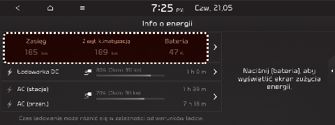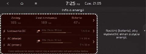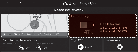 Wybrać „EV → Energy information (Informacje o energii) → Driving range, battery (Zasięg, akumulator)” na ekranie.