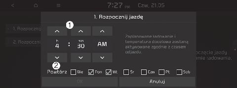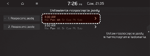 Można wybrać godzinę i dzień tygodnia, w którym ma być ładowana bateria i być włączona kontrola zarezerwowanego klimatu w celu ustawienia temperatury klimatyzatora/nagrzewnicy.