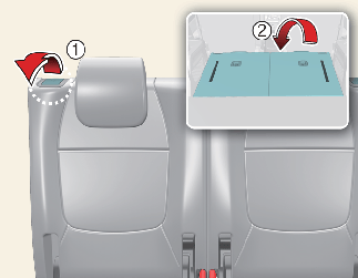 Tirer le levier de rabattement du dossier (2) ou appuyer sur le bouton de rabattement du dossier (1), puis le dossier se rabat automatiquement.