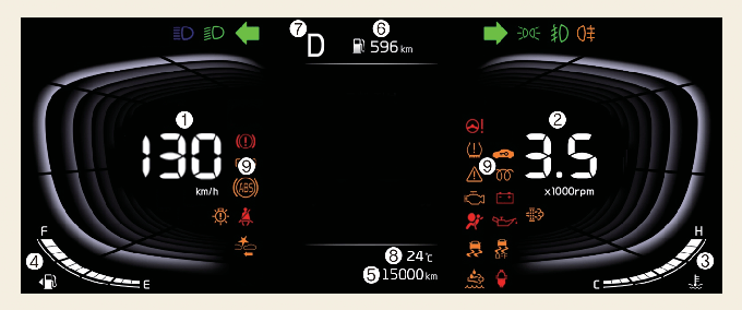 La vitesse du véhicule en kilomètres/heure (km/h) ou en miles/heure (mph).