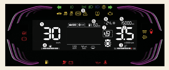 ▼4 : indique qu’il est demandé de rétrograder en 4ème (le levier de vitesses est actuellement en 5ème ou en 6ème).