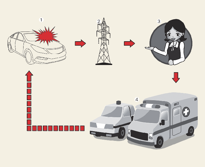 Le système permet de contacter un agent du service unique de répartition des tâches en cas d'accident de la route au Moyen-Orient. (uniquement dans les pays ayant une réglementation sur ce système)