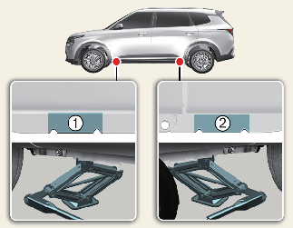 Placez le cric à l'avant (1) ou à l'arrière (2) des positions de levage désignées.