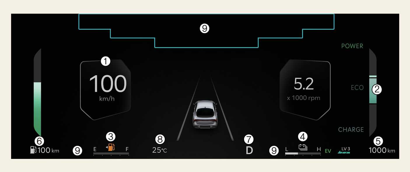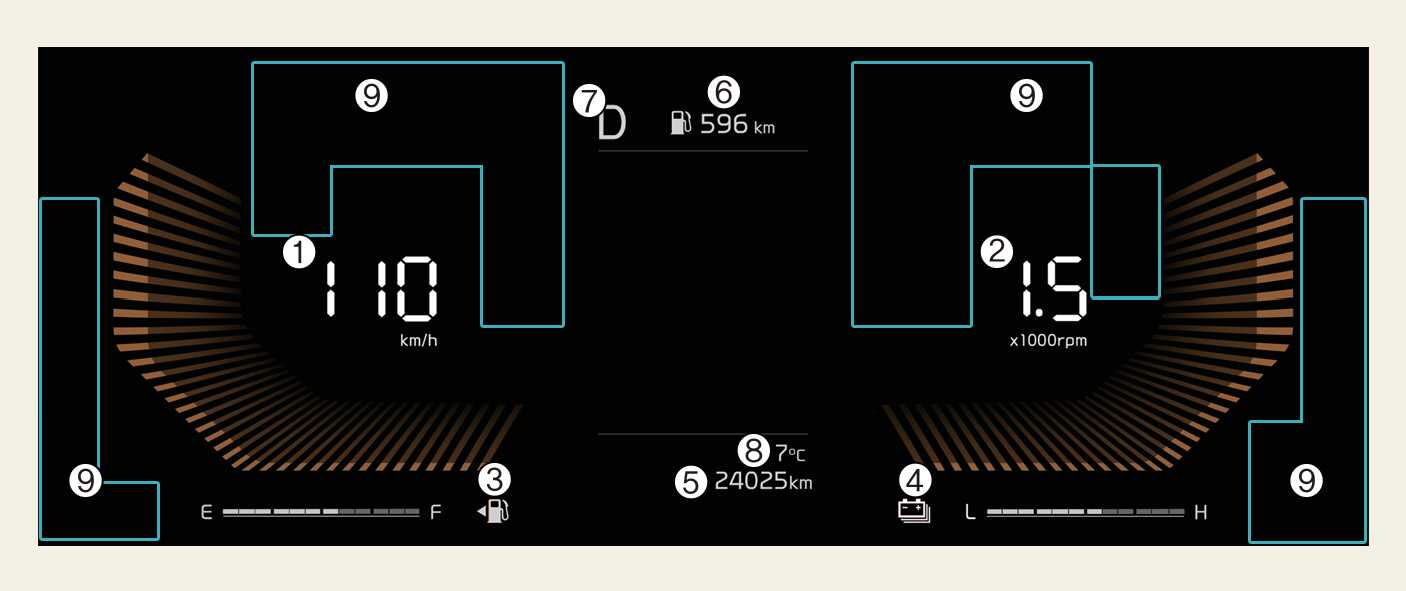 예시된 클러스터 형상과 LCD화면의 내용은 실제 차량의 형상 및 내용과 상이 할 수 있습니다.
