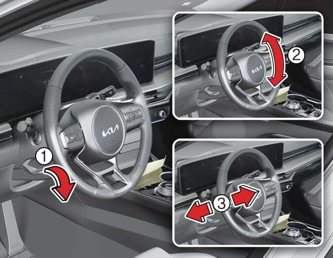 앞·뒤 조절을 할 때는 조절 레버를 아래로 당겨 내린 상태에서 스티어링 휠을 앞뒤(3)로 조절하십시오. 조절 후 조절 레버는 위로 올려 원위치한 다음 스티어링 휠이 고정되었는지 확인하십시오. 반드시 운전 전에 조절하십시오.