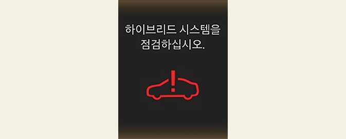 하이브리드 제어 시스템과 관련된 센서의 고장이나 액추에이터, 컴퓨터 등에 이상이 있을 때 경고문이 표시됩니다. 가까운 자사 직영 서비스센터나 서비스협력사에서 점검 및 정비를 받으십시오.