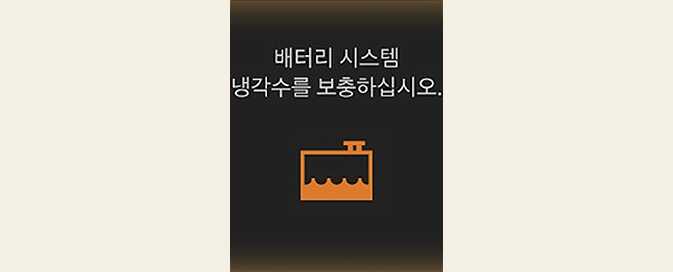 하이브리드 시스템 관련 하드웨어를 보호하는 냉각수가 부족할 경우 표시됩니다. 경고문이 표시되면 주행을 중지하고 냉각수량을 확인하시기 바랍니다. 장시간 냉각수가 부족한 상태에서 주행하면 하이브리드 시스템에 심각한 영향을 줄 수 있으며, 주행이 불가한 상태가 될 수 있습니다.