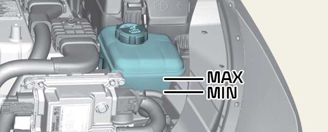 전기(동력) 장치 냉각수의 양은 엔진이 차가울 때 보조 탱크 옆면에 표시되어 있는최대선(MAX)과 최소선(MIN) 사이에 있어야 합니다.