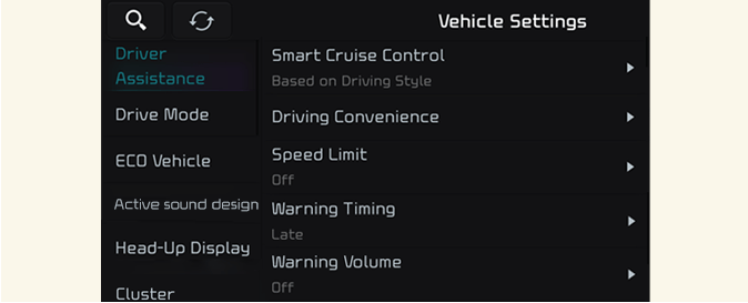 Az infotainment rendszer járműbeállításai számos beállítást kínálnak a felhasználó számára, például ajtó zárás/nyitás funkciókat, kényelmi funkciókat, a vezetéssegítő beállításokat stb.