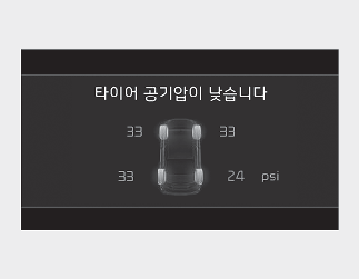 각 타이어의 공기압 수치 및 저압 상태 정보를 표시합니다.