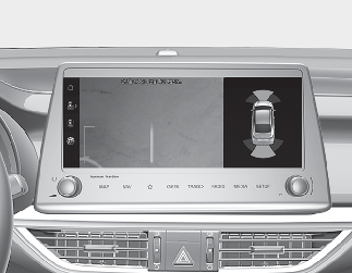)을 터치하면 차량을 위에서 내려다 보는 영상이 화면에 표시되고, 주차할 때 후방 차량과의 거리를 보여주는 기능입니다.