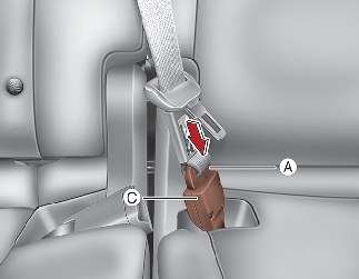 To retract the rear centre seatbelt, insert the tongue plate or similar small rigid device into the web release hole (C). Pull up on the seat belt web (A) and allow the webbing to retract automatically.