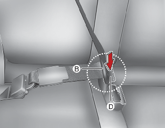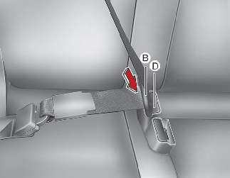 Pull the tongue plate (B) and insert the tongue plate (B) into the open end of the buckle (D) until an audible "click" is heard, indicating the latch is locked. Make sure the belt is not twisted.