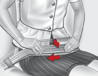 You should place the lap belt portion as low as possible and snugly across your hips, not on your waist. If the lap belt is located too high on your waist, it may increase the chance of injury in the event of a collision. Both arms should not be under or over the belt. Rather,one should be over and the other under, as shown in the illustration.