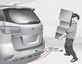 If you are positioned in the detecting area (50 ~100 cm behind the vehicle) carrying a smart key, the hazard warning lights will blink and chime will sound for about 3 seconds to alert you the smart key has been detected and the tailgate will open.