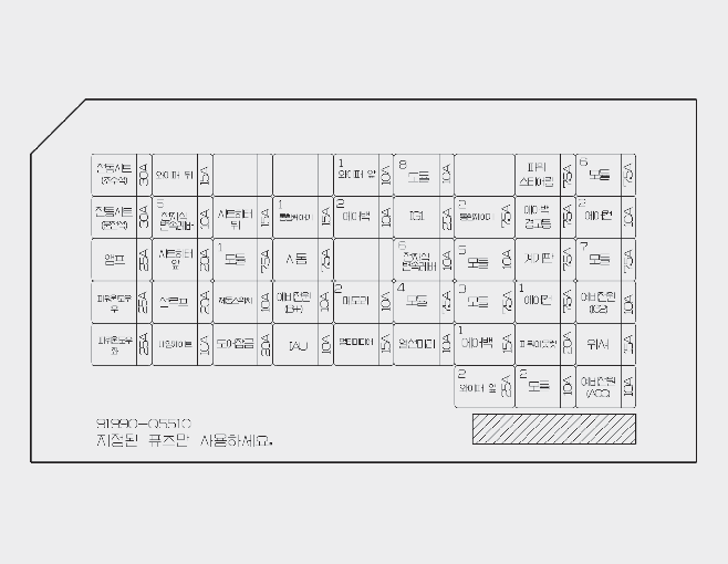 * 엔진룸 퓨즈 박스 내 이름없는 공란 퓨즈는 예비퓨즈가 아니므로 임의로 빼지 마십시오. 임의로 뺄 경우 해당 시스템이 작동하지 않을 수 있습니다.