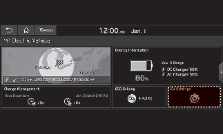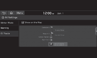 You can apply electric car-related functions for guiding the route. It allows you to check the distance that you can go with the current battery amount. Travelable and non-travelable sections on your way to the destination are displayed on the screen. The search station icon is also displayed so that you can find nearby stations immediately.