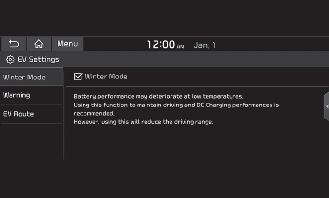 This mode is recommended to improve driving and DC charging performances during winter by raising the battery temperature to an adequate level. However, this may reduce the distance to empty significantly as the high voltage battery consumes a lot more electricity.