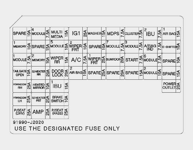 ICU Junction Block (Fuse: TAIL GATE OPEN, SUNROOF, Amplifier, P/WINDOW LH, P/WINDOW RH, S/HEATER FRT, P/SEAT (PASS), P/SEAT (DRV)) |