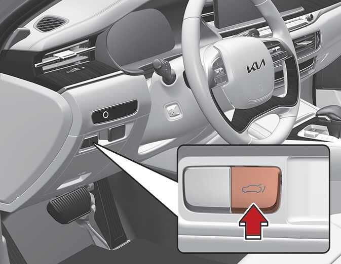 파워 트렁크 열림/닫힘 버튼(실내) ORJ041465 파워 트렁크 열림/닫힘 버튼을 누르면 비상경고등 및 경고음이 작동하며 파워 트렁크가 열립니다. 파워 트렁크를 닫고자 할 때는 파워 트렁크가 완전히 닫힐 때까지 버튼을 계속 누르십시오.