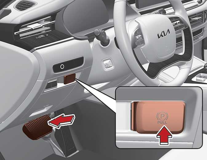 수동으로 해제할 경우에는 브레이크 페달을 밟고 전자식 파킹 브레이크 스위치를 누르십시오.