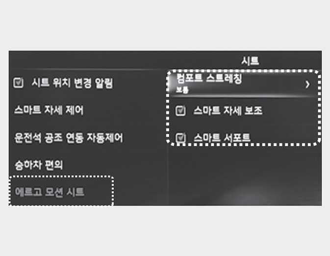 인포테인먼트 시스템의 '설정 → 차량 → 시트 → 에르고 모션 시트'를 차례로 선택하십시오. 운전자를 위한 보조 기능을 선택하거나 설정할 수 있습니다.