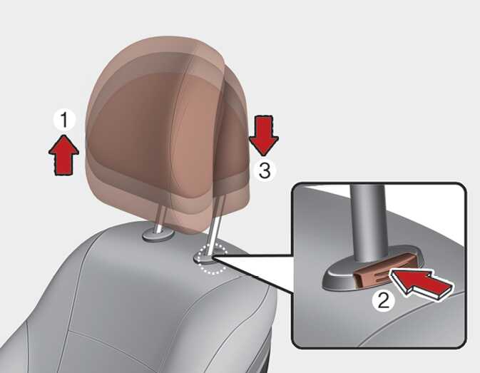 내릴 때는 잠금해제 버튼(2)을 누른 상태에서 헤드레스트를 위에서 누르십시오(3).