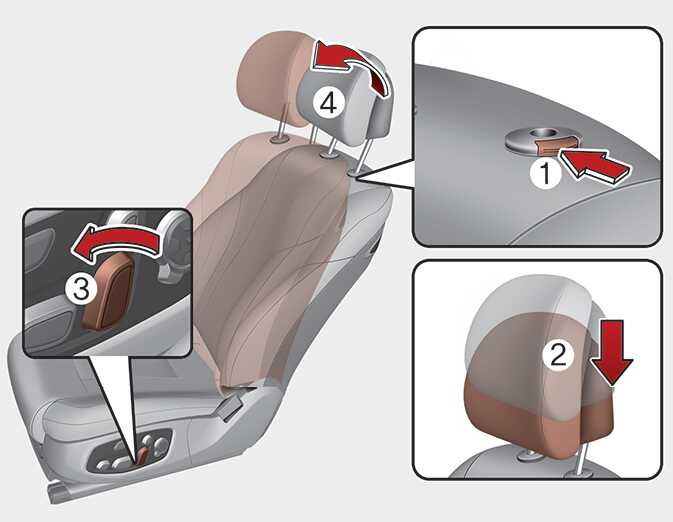 헤드레스트 높이 조절 스위치를 끝까지 올린 후(1) 헤드레스트 폴을 등받이 홈에 장한 다음(2) 높이 조절 스위치로 헤드레스트를 최하단으로 내리십시오(3).