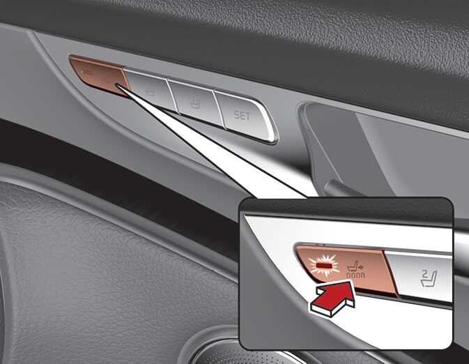 좌석 도어에 있는 DOOR 스위치가 켜져 있을 때 도어를 열면 좌석은 후방으로 이동합니다. (단, 좌석이 최후방 구간에 있으면 작동하지 않습니다.) 그 상태에서 도어를 닫으면 좌석이 다시 원위치됩니다.