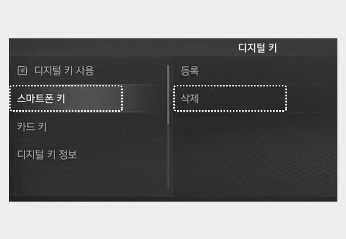 차량 내 설정 메뉴에서 다음의 절차에 따라 디지털 키(스마트폰)를 삭제하십시오.