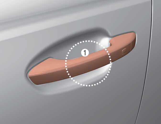 등록된 스마트폰의 NFC 안테나를 운전석 또는 동승석 도어 손잡이 인증 패드 중앙에 2초 이상 접촉하면 도어가 잠금 또는 잠금 해제됩니다.