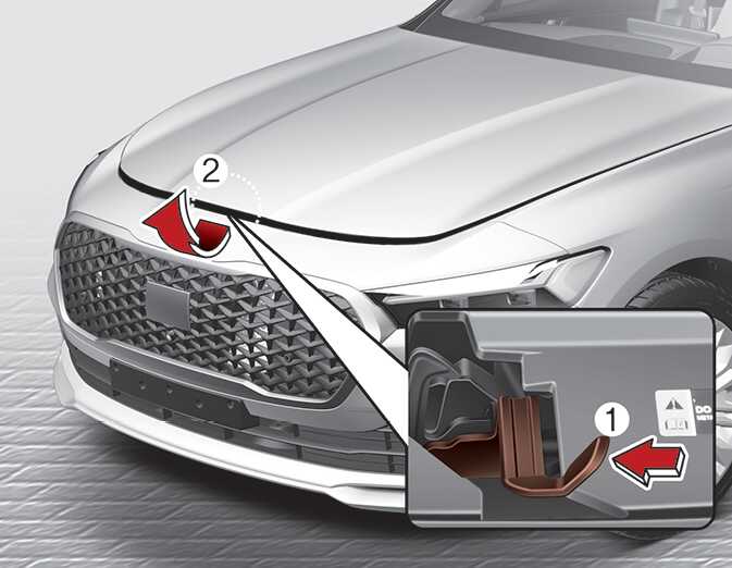 차량의 앞에서 엔진 후드를 약간 들어 올리고, 중앙에 위치한 2차 열림 레버 (1)를 왼쪽으로 밀고 있는 상태에서 후드(2)를 위로 들어 올리십시오.